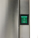 MVR72MHCEnhance the preparation of sandwiches and salads with the Maxx Cold V-Series 3 Door Refrigerated Mega Top Prep Table. Combining refrigerated storage with a convenient workspace, it offers more storage and preparation space than a standard salad and sandwich prep table. Ideal for any deli, sandwich shop, restaurant or cafe, this prep table will help optimize your foodservice operations in the front or back of house. The durable stainless-steel three-door cold prep station can accommodate full-size sheet pans. This commercial sandwich and salad prep station is designed with easy-to-grip recessed door handles and three adjustable heavy-duty wire shelves (1 per section/door) to store ingredients and backup supplies. It is equipped with a full set of clip-on divider bars and 27 4" deep plastic prep pans to hold various ingredients for easy access during sandwich and salad assembly. This three-door salad and sandwich prep station offers up to 19.6 cubic feet (555 L) of refrigerated storage that can hold 27 pans. The stainless steel prep station is equipped with a 9" deep polyethylene cutting board that provides a convenient surface for slicing and preparing ingredients. The unit is mounted on four 3" diameter swivel casters (two with brakes) for easy mobility in your busy commercial kitchen. This deli prep station features a solid state digital control system, LED temperature display and urethane foam insulated walls. The condensate evaporator is integrated to the unit, meaning no drain line connection is needed. The eco-friendly refrigeration system utilizes R290A hydrocarbon refrigerant to maintain optimum temperatures from 33°F to 40°F (1°C to 4°C). Increase kitchen efficiency with extra space with the Maxx Cold V-Series 3 Door Refrigerated Mega Top Prep Table. Covered by the Maxx Cold Six-Month Limited Warranty.
