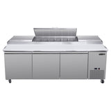 MVPP92HCStreamline your pizza preparation process with the Maxx Cold V-Series 3 Door Refrigerated Pizza Prep Table. This compact commercial pizza prep table is constructed with a stainless steel exterior and powder-coated aluminum interior for durability and easy cleaning. It is equipped with a 17.75" deep polyethylene cutting board that provides a convenient work surface for preparing and assembling pizzas. Below the work surface is a refrigerated storage space with three adjustable heavy-duty wire shelves for storing and organizing ingredients, dough and other supplies. This three-door pizza prep station measures 92 inches wide, has 30.8 cubic feet of storage and accommodates 12 pans. The unit includes four 3-inch swivel casters (two with brakes) for easy mobility in your commercial kitchen. This pizza prep fridge has a solid state digital control system, LED temperature display and urethane foam insulated walls and doors. It maintains a temperature of 33°F to 40°F (1°C to 4°C) to keep your ingredients at safe and optimal temperatures. The condensate evaporator is integrated to the unit, meaning no drain line connection is needed. Ideal for pizzerias, restaurants and other foodservice establishments, the Maxx Cold V-Series 3 Door Refrigerated Pizza Prep Table lets you keep a wide variety of pizza toppings organized and within easy reach for quick and efficient pizza assembly. Covered by the Maxx Cold Six-Month Limited Warranty.