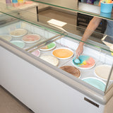 MXDC-12The Maxx Cold X-Series Ice Cream Dipping Cabinet Freezer is the perfect solution for displaying and serving ice cream products. The ice cream dipping freezer provides a sanitary, efficient way to serve your customers, and the durable construction offers a cost-effective solution for your operation. This commercial ice cream dipping cabinet is designed for ice cream parlors, restaurants, sorbet and gelato shops, cafes, concession stands and more. The 70-inch ice cream cabinet has a storage capacity of 16 cubic feet and can hold up to 22 ice cream tubs. The tub holders are constructed of coated wire with acrylic covers. This ice cream freezer dipping cabinet is designed with interior LED lights to illuminate the display area and highlight the ice cream flavors, attracting customers' attention. Flat, tempered clear glass sliding lids make it easy to scoop ice cream, especially during busy times. The sneeze guard ensures customers can view your ice cream while preventing contamination. The dipping cabinet features an easy-to-read external digital thermometer display with an adjustable temperature range of -18°F to 10°F (-28°C to -12°C), maintaining ice cream at the ideal serving temperature. The mobile ice cream dipping cabinet is equipped with four heavy-duty casters, two with brakes. Additional features include 2.5" foamed-in-place polyurethane insulation, a lock and key set with a removable pin, removable rubber bumper guards and a heated molded plastic lid frame that prevents frost build-up. Enhance the presentation, visibility and quality of your ice cream offerings with the Maxx Cold X-Series Ice Cream Dipping Cabinet Freezer with Curved Glass Sneeze Guard. Covered by the Maxx Cold One-Year Parts & Labor + Five-Year Compressor (Part Only) Warranty.