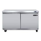 MVF48UHCThe Maxx Cold V-Series 2 Door Undercounter Freezer provides convenient frozen storage without sacrificing valuable floor space in your commercial kitchen. This compact undercounter freezer features a stainless steel exterior and powder coated aluminum interior for durability and ease of cleaning. Measuring 48 inches wide, it offers 14.1 cubic feet of storage and has two doors with easy-to-grip recessed handles. This stainless steel undercounter freezer has two adjustable heavy-duty wire shelves for storing and organizing frozen foods and ingredients such as meat, desserts, seafood and more. With its compact size, this commercial undercounter freezer easily fits under counters and other workspaces, making it ideal for kitchens with limited space. The unit includes four 3" swivel casters (two with brakes) for easy mobility and cleaning. Additional features include a solid state digital control system, LED temperature display, and urethane foam insulated walls and doors. The unit has a temperature range of 0°F to 10°F to hold your frozen products at their ideal storage conditions. The condensate evaporator is integrated to the unit, meaning no drain line connection is needed. The Maxx Cold V-Series 2 Door Undercounter Freezer offers quick access to frozen ingredients, making it a valuable addition for restaurants, pizzerias, bars, bakeries, cafes and more. Covered by the Maxx Cold Six-Month Limited Warranty.