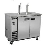 MXBD48-2SHCThe Maxx Cold X-Series Dual Tower, 2 Tap Beer Dispenser is engineered for durable usage, efficient performance and easy cleaning. It accommodates 2 barrels/kegs, providing up to 10.5 cubic feet (297 L) of storage capacity. This beer tower is equipped with two 3-inch (77mm) diameter stainless steel insulated beer tower dispensers that can accommodate two different liquids. The double-tower beer dispenser is ideal for pubs, bars, breweries, catering services, banquet halls or special events and parties requiring a draft brew. The exterior and top of the kegerator are constructed of stainless steel, while the interior of the cabinet is crafted in sanitary white powder-coated steel paired with a stainless steel floorplate. This unit is fully insulated with 2-inch (50 mm) CFC-free polyurethane on the walls and doors. The standard 3-inch (77 mm) polished stainless-steel draft tower dispensers, which are mounted to the top center counter, are cooled by continuous cold air circulation to maintain tap temperature that reduces foam when dispensing and can easily fill pint beer glasses, frosted beer mugs and pitchers. The self-contained forced-air refrigeration system cools the base cabinet and tower to optimize temperature throughout your commercial operations. The solid-state digital control system is designed with LED temperature display. This beer tower dispenser is engineered to facilitate maintenance and maneuvering by the operator, with an easy-to-clean slide-out condensing unit, recessed drawer handles (with locks) and four swivel casters (two with brakes). The dispenser is equipped with an integrated condensate evaporator, meaning no drain line connection is needed. Operation requires CO2 tank and regulator (not included). Quickly and efficiently serve draft beer to your guests with the Maxx Cold X-Series Dual Tower Two Tap Beer Dispenser. Covered by the Maxx Cold One-Year Parts & Labor + Five-Year Compressor (Part Only) Warranty.