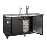 MXBD72-2BHCThe Maxx Cold X-Series Dual Tower, 2 Tap Beer Dispenser is engineered for durable usage, efficient performance and easy cleaning. It accommodates 3 barrels/kegs, providing up to 17.3 cubic feet (490 L) of storage capacity. This beer tower is equipped with two 3-inch (77mm) diameter stainless steel insulated beer tower dispensers that can accommodate two different liquids. The double-tower beer dispenser is ideal for pubs, bars, breweries, catering services, banquet halls or special events and parties requiring a draft brew. The exterior of the kegerator is constructed of black powder-coated steel with a stainless steel top, while the interior of the cabinet is crafted in sanitary white powder-coated steel paired with a stainless steel floorplate. This unit is fully insulated with 2-inch (50 mm) CFC-free polyurethane on the walls and doors. The standard 3-inch (77 mm) polished stainless-steel draft tower dispensers, which are mounted to the top center counter, are cooled by continuous cold air circulation to maintain tap temperature that reduces foam when dispensing and can easily fill pint beer glasses, frosted beer mugs and pitchers. The self-contained forced-air refrigeration system cools the base cabinet and tower to optimize temperature throughout your commercial operations. The solid-state digital control system is designed with LED temperature display. This beer tower dispenser is engineered to facilitate maintenance and maneuvering by the operator, with an easy-to-clean slide-out condensing unit, recessed drawer handles (with locks) and six swivel casters (two with brakes). The dispenser is equipped with an integrated condensate evaporator, meaning no drain line connection is needed. Operation requires CO2 tank and regulator (not included). Quickly and efficiently serve draft beer to your guests with the Maxx Cold X-Series Dual Tower Two Tap Beer Dispenser. Covered by the Maxx Cold One-Year Parts & Labor + Five-Year Compressor (Part Only) Warranty.