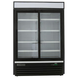 MXM2-48RSBHCMaxx Cold Glass Door Merchandisers are designed for durability and visual appeal to display products for commercial foodservice purposes. The Maxx Cold Double Sliding Glass Door Merchandiser Cooler Refrigerator is energy efficient and effective at displaying products at the right temperature to preserve freshness and prolong shelf life. It has two double-pane insulated sliding glass doors, making it easy for customers to view and access your product selection. Eight adjustable heavy-duty wire shelves hold various beverages and foods, from soda and bottled water to sandwiches and salads. Simple-to-use, programmable solid-state digital controls deliver accurate temperature regulation. This glass door merchandiser is constructed of black powder-coated steel exterior and powder-coated aluminum interior. It provides up to 48 cubic feet of storage capacity. The unit is supplied with an illuminated top panel for advertising and promoting your products. A lock and key set is included for security. This glass door merchandiser refrigerator is ideal for your commercial needs.