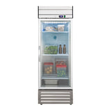 MVR-23GDHCIdeal for showcasing your goods in restaurants, cafes, bakeries, catering businesses and more, the Maxx Cold V-Series 1 Glass Door Reach-In Refrigerator is a smart investment. Offering ample storage space for perishable goods, ingredients, prepared foods and beverages, this commercial reach-in refrigerator measures 27"W and has a storage capacity of 19 cubic feet. Built to withstand the demands of a commercial kitchen environment, it is constructed of a durable, easy-to-clean stainless steel exterior and painted aluminum interior. This reach-in refrigerator has one self-closing, locking, dual-pane glass door with an easy-to-grip handle, and the unit's open door alert beeps when the door has been open for three minutes. The transparent door creates an attractive display that enhances product visibility, promotes impulse purchases and makes it easier to locate items. Four adjustable heavy-duty wire shelves let you efficiently organize and store food and beverage items. The unit has an easily accessible bottom mount for cleaning and is equipped with 4-inch swivel casters for easy mobility in your commercial kitchen. The digital control system lets you easily adjust the temperature with the range of 34°F to 40°F (1°C to 4°C), and the LED temperature display is easy to read. This single-door reach-in refrigerator features automatic interior lighting, an automatic defrost system and urethane foam insulated walls. The unit is equipped with an integrated condensate evaporator; therefore, no drain line connection is needed. Investing in the Maxx Cold V-Series 1 Glass Door Reach-In Refrigerator is a practical and essential decision for businesses in the foodservice industry. Covered by the Maxx Cold Six-Month Parts and Labor Limited Warranty.