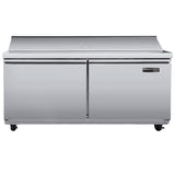 MVR60SHCDesigned to streamline the preparation of sandwiches and salads, the Maxx Cold V-Series 2 Door Refrigerated Sandwich and Salad Prep Station combines refrigerated storage with a convenient workspace. Ideal for any deli, sandwich shop, restaurant or cafe, this prep table will help optimize your foodservice operations in the front or back of house. The durable stainless-steel two-door cold prep station can accommodate full-size sheet pans. This commercial sandwich and salad prep station is designed with easy-to-grip recessed door handles and two adjustable heavy-duty wire shelves (1 per section/door) to store ingredients and backup supplies. It is equipped with a full set of clip-on divider bars and sixteen (16) 4" deep plastic prep pans to hold various ingredients for easy access during sandwich and salad assembly. This two-door salad and sandwich prep station offers up to 17.3 cubic feet (490 L) of refrigerated storage that can hold 16 pans. The stainless steel prep station is equipped with an 11.42" deep polyethylene cutting board that provides a convenient surface for slicing and preparing ingredients. The unit is mounted on four 3" diameter swivel casters (two with brakes) for easy mobility in your busy commercial kitchen. This deli prep station features a solid state digital control system, LED temperature display and urethane foam insulated walls. The condensate evaporator is integrated to the unit, meaning no drain line connection is needed. The eco-friendly refrigeration system utilizes R290A hydrocarbon refrigerant to maintain optimum temperatures from 33°F to 40°F (1°C to 4°C). Enhance kitchen efficiency with the Maxx Cold V-Series 2 Door Refrigerated Sandwich and Salad Prep Station. Covered by the Maxx Cold Six-Month Limited Warranty.