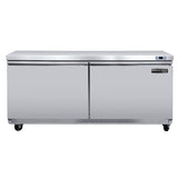 MVR60UHCThe Maxx Cold V-Series 2 Door Undercounter Refrigerator provides convenient refrigerated storage without sacrificing valuable floor space in your commercial kitchen. This compact undercounter refrigerator features a stainless steel exterior and powder coated aluminum interior for durability and ease of cleaning. Measuring 60 inches wide, it offers 18.5 cubic feet of storage and has two doors with easy-to-grip recessed handles. This stainless steel undercounter refrigerator has two adjustable heavy-duty wire shelves for storing and organizing chilled foods and ingredients such as vegetables, fruit, meat and more. With its compact size, this commercial undercounter fridge easily fits under counters and other workspaces, making it ideal for kitchens with limited space. The unit includes four 3" swivel casters (two with brakes) for easy mobility and cleaning. Additional features include a solid state digital control system, LED temperature display, and urethane foam insulated walls and doors. The unit has a temperature range of 33°F to 40°F to hold your chilled products at their ideal storage conditions. The condensate evaporator is integrated to the unit, meaning no drain line connection is needed. The Maxx Cold V-Series 2 Door Undercounter Refrigerator offers quick access to refrigerated ingredients, making it a valuable addition for restaurants, pizzerias, bars, bakeries, cafes and more. Covered by the Maxx Cold Six-Month Limited Warranty.