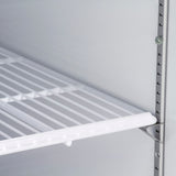 MXCR-49FDHCMaxx Cold 53.9 inch wide double door, top mount reach-in refrigerator is designed to assist you in meeting all food service industry requirements while making its content easy to access. The cabinet is equipped with 6 heavy-duty fully adjustable and easy to clean PE coated wire shelves which can hold full size sheet pans and provides up to 49 cubic ft. (1387 L) of storage capacity, while its solid and slender build makes it a great choice for limited spaces. In addition, the double door commercial refrigerator model is engineered with an open-door alert that beeps if the refrigerator is left open for three minutes. This environment friendly reach-in commercial grade refrigerator is constructed of durable stainless steel (exterior) and sanitary white painted aluminum (interior). The unit is mounted on 4” diameter swivel caster wheels that can easily be maneuvered. Standard features on this premium indoor refrigerator include integrated energy saving interior LED lighting, automatic defrost function, lock and key set for security and digital temperature control which maintains optimum temperature. Digital temperature display can be viewed from outside the cabinet, which is engineered with an integrated condensate evaporator; meaning no drain line connection is needed. The urethane foam insulation on this two-door commercial refrigerator provides outstanding thermal regulation and is energy efficient. *Item not approved for sale in California