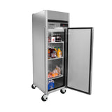 MCRT-23FDHCThe Maxx Cold Single Door Reach-In Top Mount Refrigerator is designed to assist you in meeting all foodservice industry requirements while making its content easy to access. The cabinet is equipped with three heavy-duty fully adjustable and easy-to-clean PE-coated wire shelves which can hold full-size sheet pans. The unit provides up to 23 cubic feet of storage capacity, while its slender and solid build makes it a great choice for limited or compact spaces. This commercial refrigerator is engineered with an open-door alert that beeps if the refrigerator is left open for five minutes and the single door model is field reversible. This reach-in commercial refrigerator is constructed of a durable stainless steel exterior and interior, and is mounted on 4-inch diameter swivel caster wheels that can easily be maneuvered. Standard features on this premium indoor refrigerator include integrated energy saving interior LED lighting, automatic defrost function, lock and key set for security and digital temperature control which maintains optimum temperature. Digital temperature display can be viewed from outside the cabinet, which is engineered with an integrated condensate evaporator; meaning no drain line connection is needed. The environmentally friendly polyurethane foam insulation on this one-door commercial refrigerator provides outstanding thermal regulation and is very energy efficient. This unit meets Energy Star guidelines.