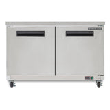 MXCR48UHCDesigned to provide maximum storage, significant energy savings and cold, accurate temperatures, the Maxx Cold Double Door Undercounter Refrigerator is ideal for food storage needs in commercial settings. This two-door undercounter refrigerator provides easy accessibility, optimum capacity and flexibility for quick and efficient food preparation. Made of a durable, easy-to-clean stainless steel exterior and painted aluminum interior, this compact refrigerator features 12 cubic feet of storage space and two doors with easy-to-grip recessed door handles. Each section includes an adjustable heavy-duty wire shelf to organize your food, beverages and ingredients. The unit is equipped with four, 3-inch swivel casters for easy maneuverability in tight spaces. This compact refrigerator is engineered with a digital temperature display, which can be viewed from outside the cabinet. This unit is equipped with an integrated condensate evaporator, meaning no drain line connection is needed. This two-door undercounter refrigerator is engineered with urethane insulation, which provides outstanding thermal regulation for energy efficiency. Ideal for a variety of settings, including cafes, snack bars, concession stands and more, the Maxx Cold Double Door Undercounter Refrigerator is a wise choice for your food storage needs.