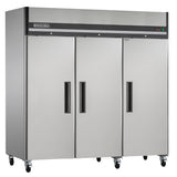MXCF-72FDHCStore frequently accessed foodservice products within reach and at the proper storage temperature with the Maxx Cold Triple Door Reach-in Freezer. Constructed of durable stainless steel, this commercial reach-in freezer features three self-closing doors and a painted aluminum interior. The cabinet is equipped with nine heavy-duty fully adjustable and easy to clean wire shelves which can hold full size sheet pans. This unit provides up to 72 cubic feet of available storage, to hold various frozen foods like meat, seafood, desserts and more. This triple door commercial freezer model is engineered with an open-door alert that beeps if the freezer is left open for three minutes. The unit is mounted on 4-inch diameter swivel caster wheels that can easily be maneuvered. Standard features on this premium indoor freezer include integrated energy saving interior LED lighting, automatic defrost function, recessed door handles with locks and digital temperature control which maintains optimum temperature. Digital temperature display can be viewed from outside the cabinet, which is engineered with an integrated condensate evaporator; meaning no drain line connection is needed. The environmentally friendly urethane foam insulation on this three-door commercial freezer provides outstanding thermal regulation and is energy efficient.