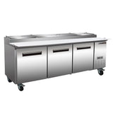 MXCPP92HCEasily prepare and assemble pizzas in your commercial foodservice establishment with the Maxx Cold X-Series Three-Door Refrigerated Pizza Prep Table. This pizza prep station is constructed with a durable stainless steel exterior and powder-coated aluminum interior. This commercial pizza prep table includes a full set of divider bars and twelve 4" deep plastic pans for holding ingredients such as dough, sauces, cheeses, meats and vegetables. The pizza prep unit features a 17.75" deep polyethylene cutting board that offers space for assembling pizzas. It has three doors with easy-to-grip recessed handles. It provides 32 cubic feet (906 L) of refrigerated storage beneath the worktop for storing additional ingredients, sauce containers or other pizza-making essentials. Three adjustable heavy-duty wire shelves (1 per section/door) accommodate full-size sheet pans. This energy-efficient pizza prep fridge is engineered with urethane foam insulated walls and doors. Additionally, it features a solid-state digital control system, LED temperature display and an integrated condensate evaporator, which means that no drain line connection is needed. This three-door commercial pizza prep table is equipped with four 3" diameter swivel casters (two with brakes) for easy maneuvering when needed. The eco-friendly refrigeration system utilizes R290A hydrocarbon refrigerant to maintain optimum temperatures from 33°F to 41°F (1°C to 5°C). Streamline your pizza-making process by providing a designated workspace for assembling pizzas in your commercial kitchen, pizzeria, restaurant or cafe with the Maxx Cold X-Series Three-Door Refrigerated Pizza Prep Table. Covered by the Maxx Cold One-Year Parts & Labor + Five-Year Compressor (Part Only) Warranty.
